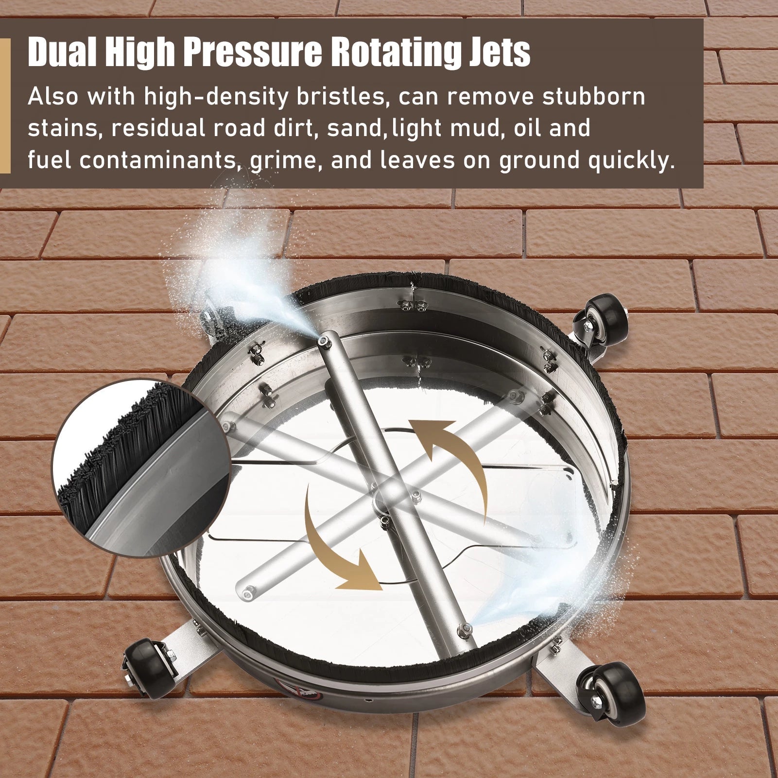 [Efficient Cleaning] With dual high pressure rotating jets and high-density bristles, can effectively remove stubborn stains, residual road dirt, sand, light mud, oil and fuel contaminants, grime, and leaves on ground quickly.
