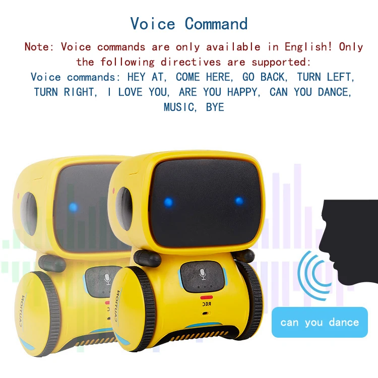 4. Only support voice commands: HEY AT, COME HERE, GO BACK, TURN LEFT, TURN RIGHT, I LOVE YOU, ARE YOU HAPPY, CAN YOU DANCE, MUSIC, BYE