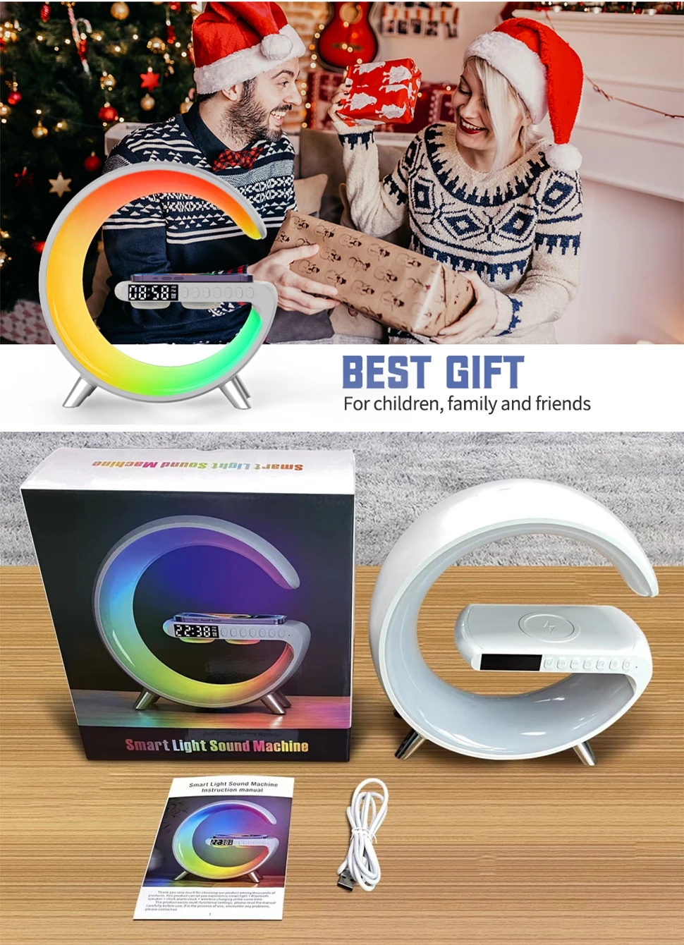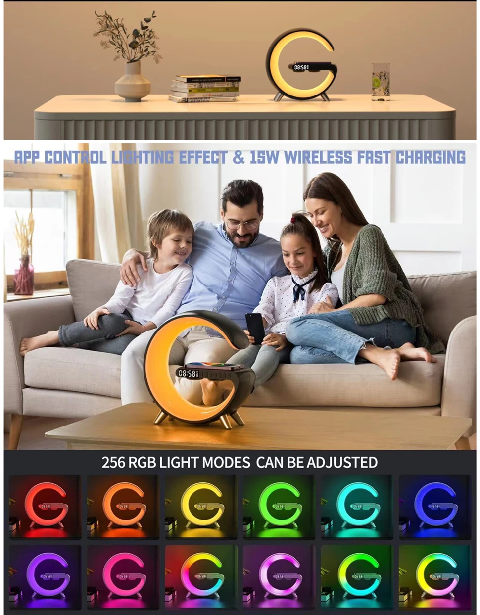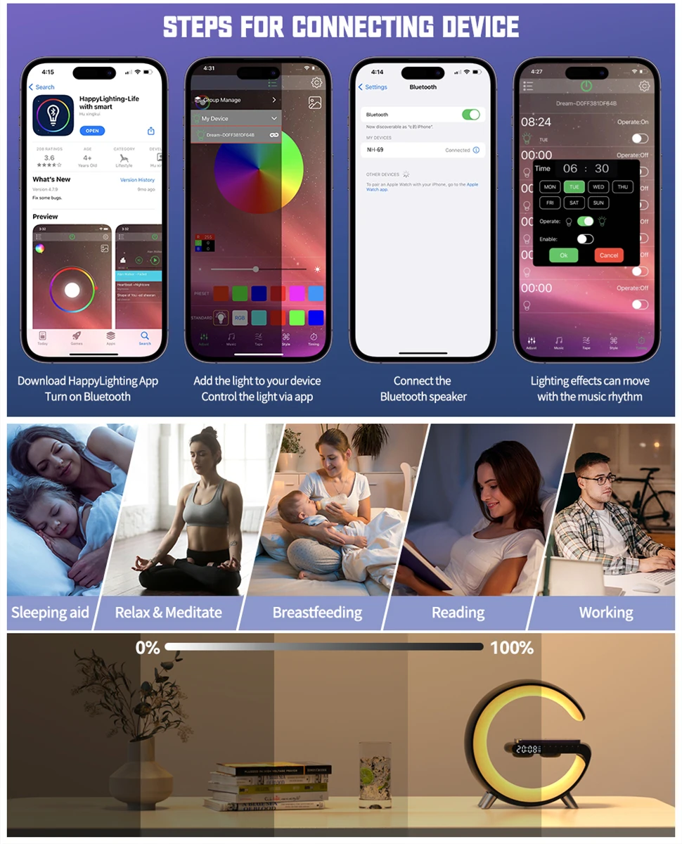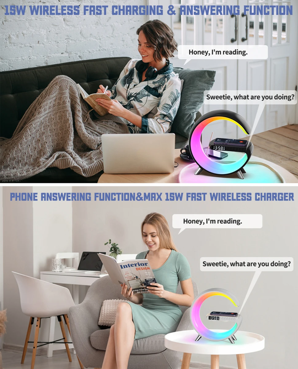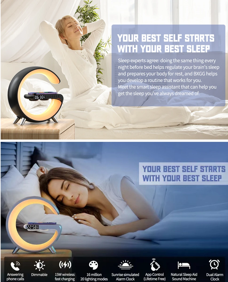1. Multifunctional Wireless Charging Atmosphere Light: It is not only an atmosphere light, but also 15W fast wireless charging, Bluetooth speaker, music rhythm, sleep light, sunrise wake-up light, atmosphere light, bedside light, glare effect, Bluetooth audio, clock, alarm clock, etc. You can use this great light while working, studying, reading and sleeping. very convenient.